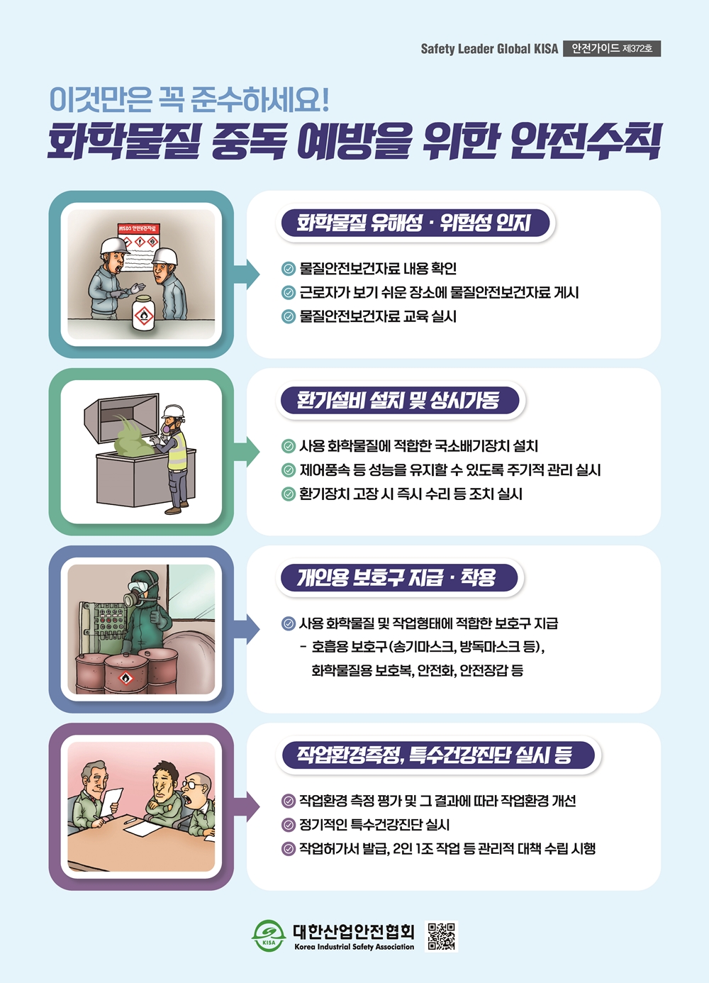 안전포스터 안전포스터 안전보건표지 교육자료 재해사례 서식자료 화학물질 중독 예방을 위한 안전수칙 ⓒ 대한산업안전협회 ∥ 무단도용, 복제 및 재배포 금지 제372호_화학물질 중독 예방을 위한 안전수칙.jpg 이전글 고소작업대 작업 안전 다음글 이동식 사다리 작업 안전 목록