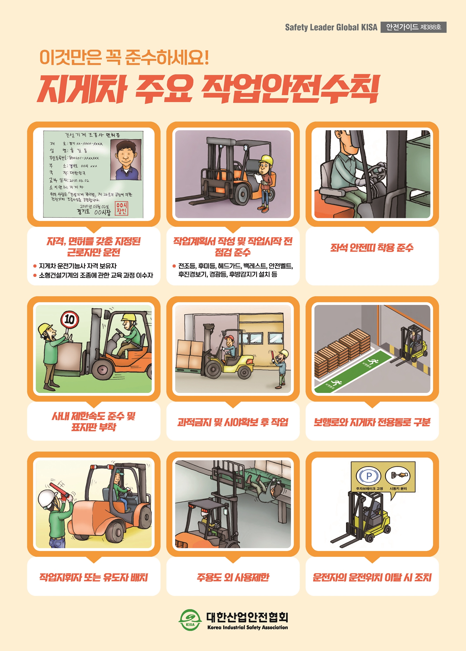 안전포스터 안전포스터 안전보건표지 교육자료 재해사례 서식자료 지게차 주요 작업안전수칙 ⓒ 대한산업안전협회 ∥ 무단도용, 복제 및 재배포 금지 제388호_지게차 주요 작업안전수칙.jpg 이전글 겨울철 한랭질환 예방수칙 다음글 근골격계질환 예방을 위한 안전수칙 목록