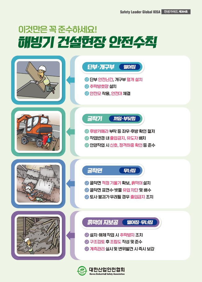 안전포스터 안전포스터 안전보건표지 교육자료 재해사례 서식자료 해빙기 건설현장 안전수칙 ⓒ 대한산업안전협회 ∥ 무단도용, 복제 및 재배포 금지 제394호_해빙기 건설현장 안전수칙.jpg 이전글 화물자동차 주요 안전수칙 다음글 폭염 대비 온열질환 예방수칙 목록