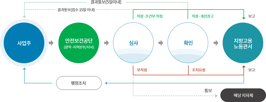 사엄주 > 안전보건공단(광역 · 지역본부/지사) > 심사(적정·조건부 적정 시 확인 후 보고/부적정시 조치요청 후 보고) > 확인 > 지방고용 노동 관서