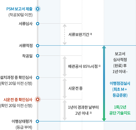 PSM보고서의 제출시기, 설치과정 · 시운전 중 및 이행상태점검 및 평가 시기는 관련법령, 고시 및 KOSHA GUIDE에 의거 아래와 같음