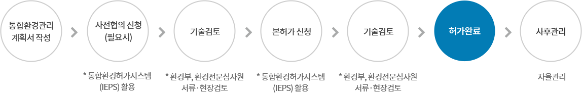 - 통합환경관리계획서 작성 후, 사전협의와 본허가를 통해 기술검토를 완료한 뒤 환경부의 최종 허가승인(허가완료)을 받게 됩니다.