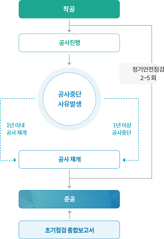구분 : 정기안전점검, 초기점검, 공사 재개전 안전점검(1년 이상 공사 중단 후 재개시), 정밀안전점검(필요시)