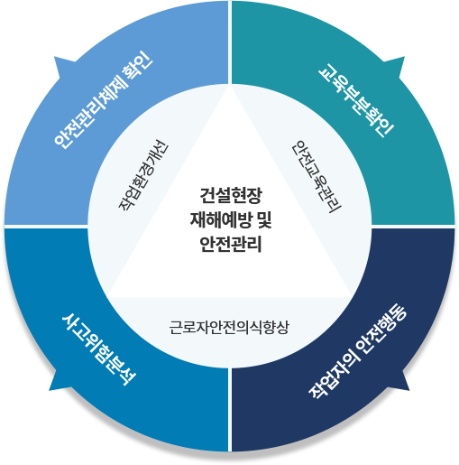 현장진단을 통한 환경 개선 - 현장의 공종별 잠재된 유해,위험성과 유해인자를 도출하고 그 문제점 및 개선대책을 제시하여 현장 작업환경 개선
