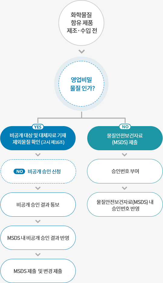 화학물질의 안전한 사용을 위하여 물질안전보건자료(MSDS) 대상물질을 제조하거나 수입하기 위한 물질안전보건자료(MSDS)작성·제출과 제조사의 영업비밀을 지키기 위한 비공개 승인을 보장합니다.